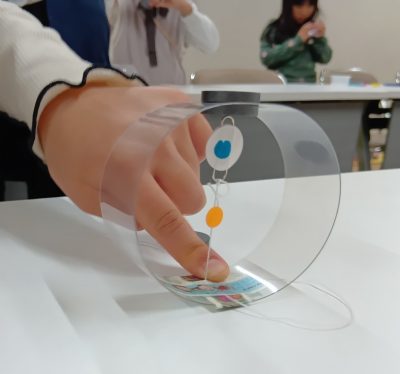 まずはじめに、電池と磁石と銅線を使い、巻いた銅線の中を電池が電車のように進む“電池電車”の実演をしました。子どもたちは銅線の中をひとりでに進む電池の動きに興味津々。実演後は、実際に磁石の力を見てみよう!感じよう!ということで、「クルクル磁石」を作りました。薄いプラスチックの板を丸め、磁石を貼り付けた後、中に糸でクリップを取り付けると、磁石の力でクリップがクルクルと動きます。