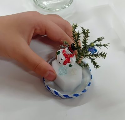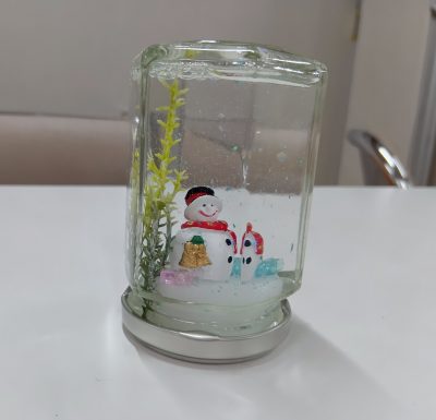 スノードームの入れ物は、リサイクル瓶を使いました。まちまちな形の物から好きなものを選んで、スノードームの中に入れる小物、量も自分好みで調整。選ぶのって楽しいよね♪