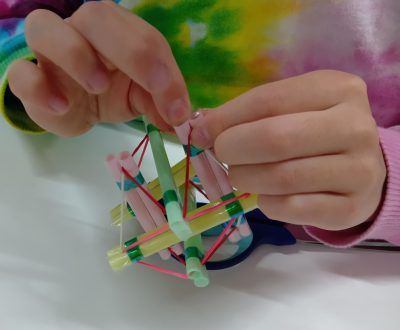 ストローと輪ゴムを組み合わせた部品を作り、さらにそれらを組み合わせて立体にしていきます。完成後はつぶしても元に戻ることを確認しました。自分で作ることで、構造がわかりますね。